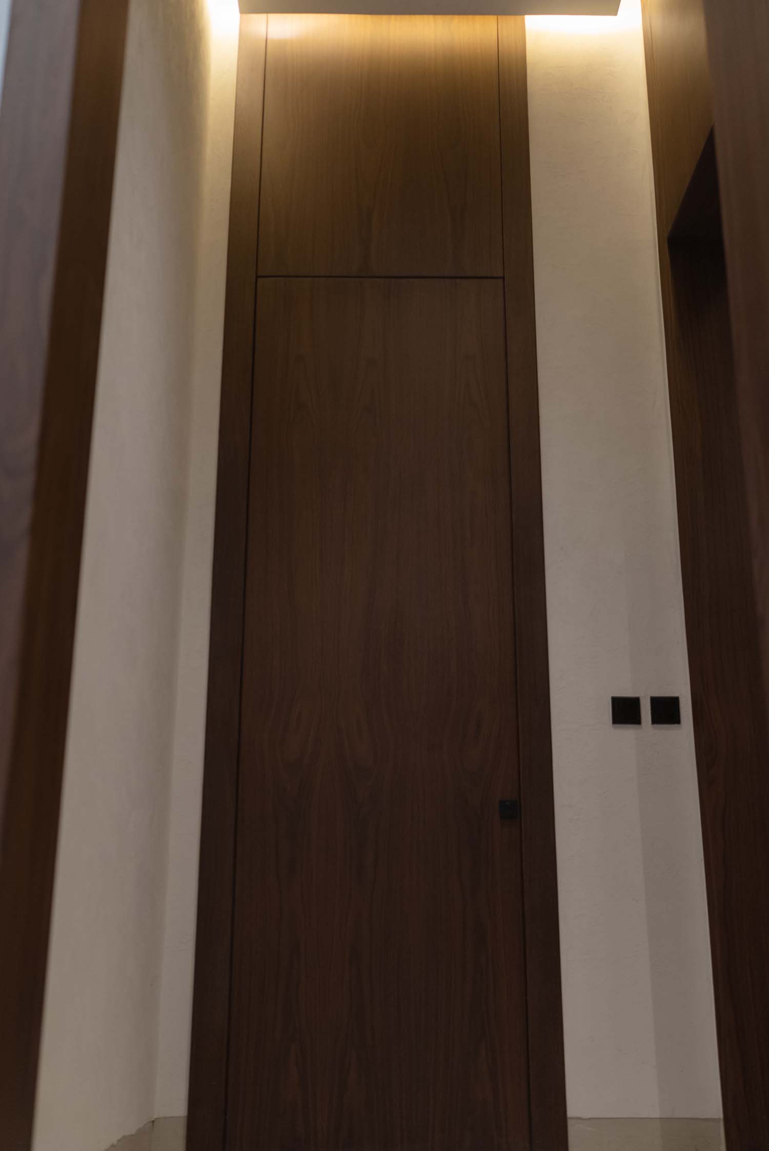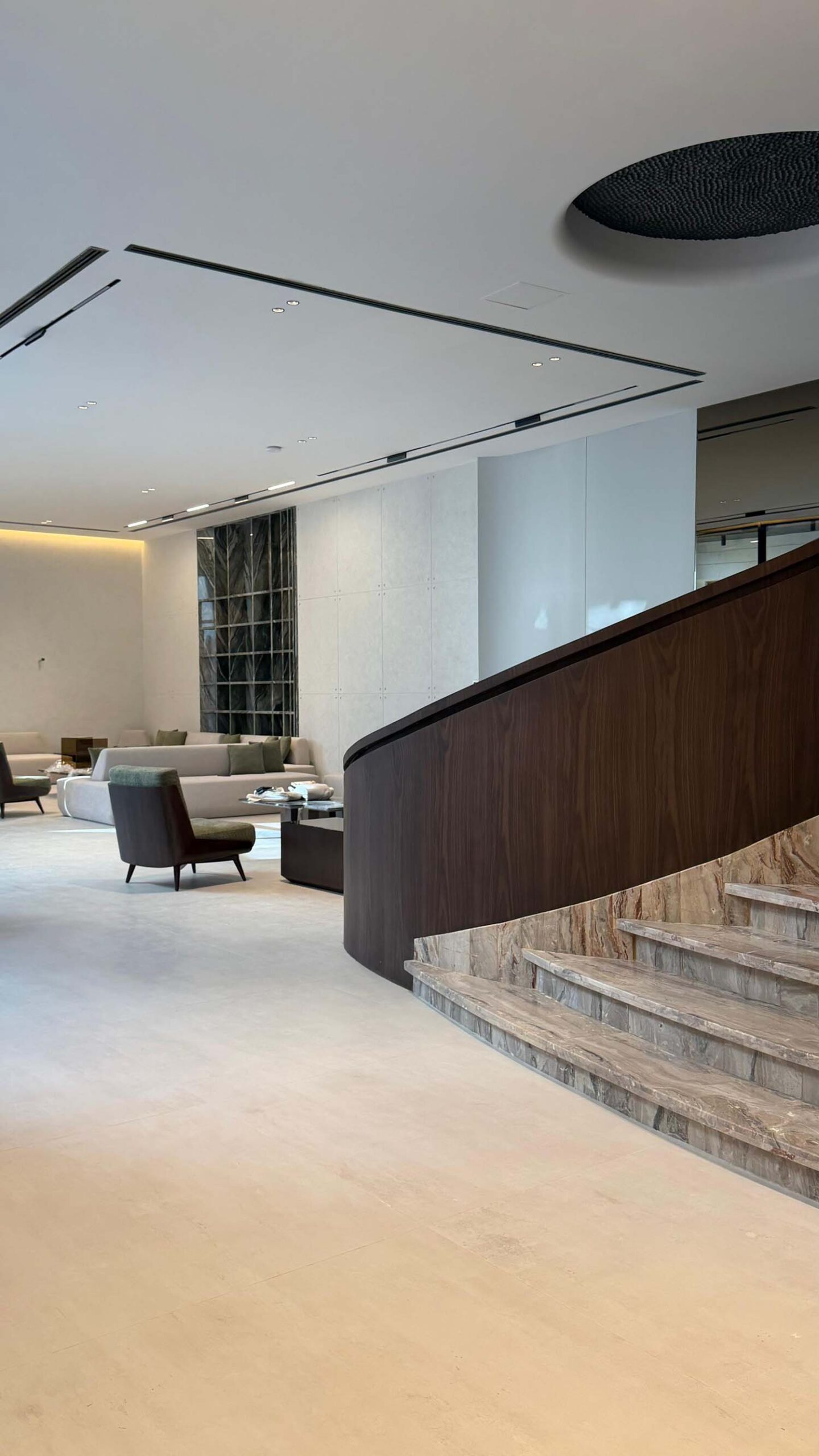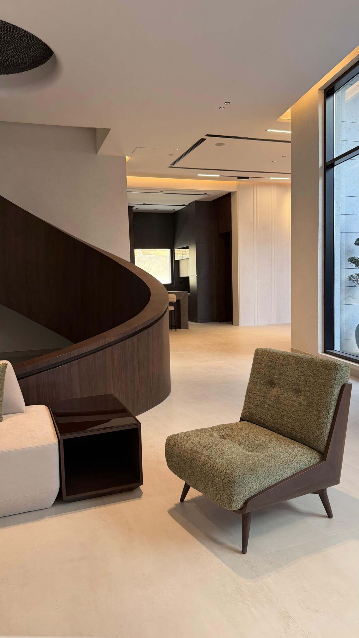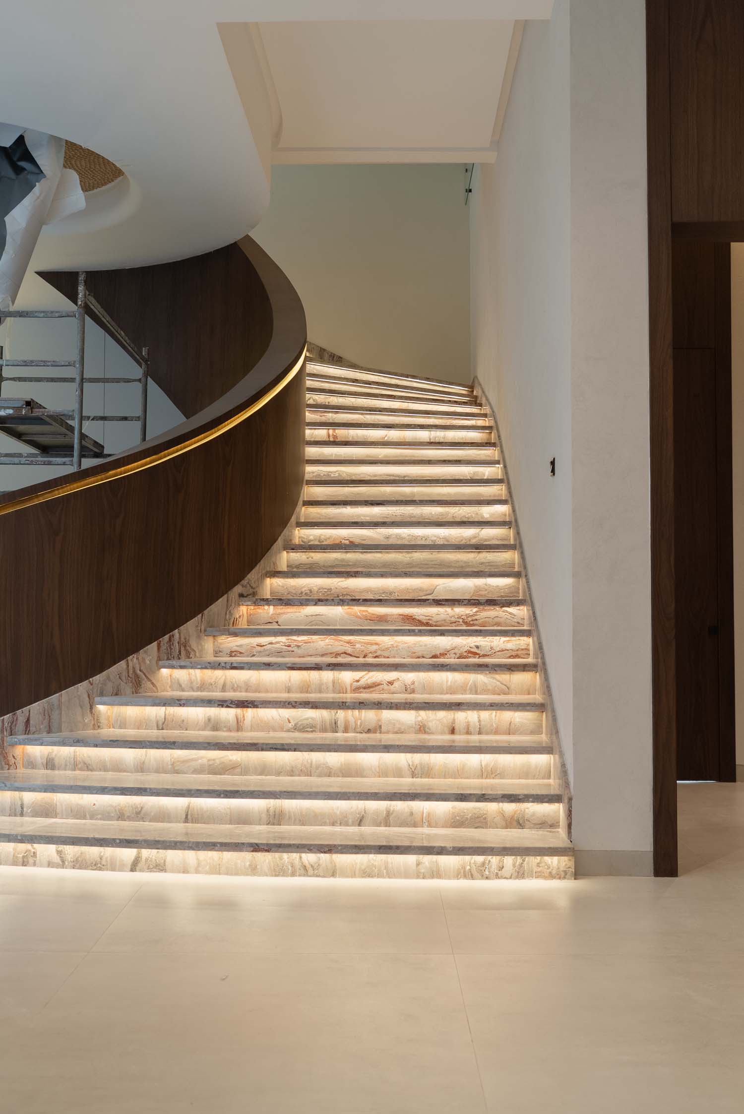 Complete interior finishing with custom woodwork, wall panels, kitchen installation, handrail, and bespoke furniture.