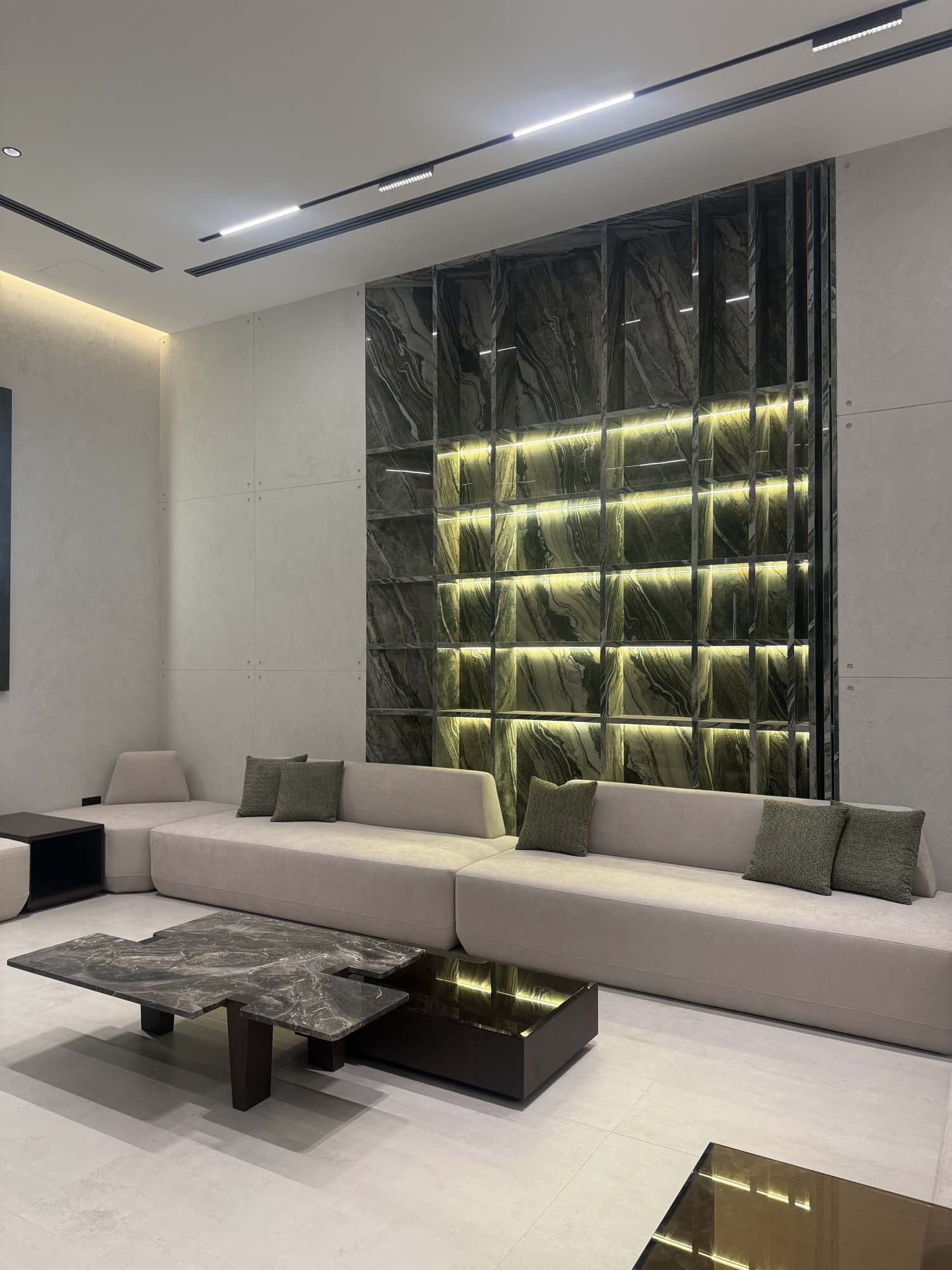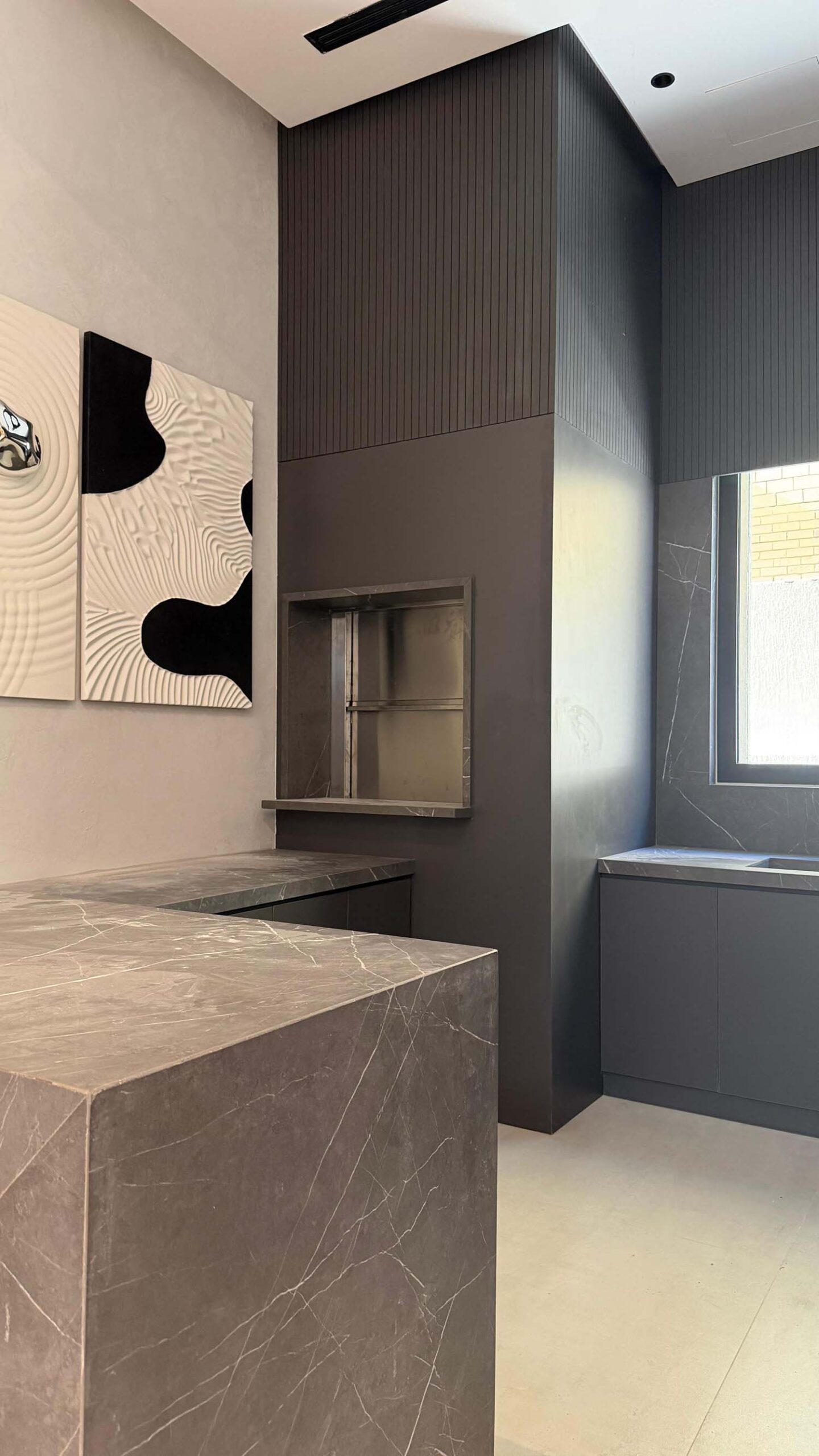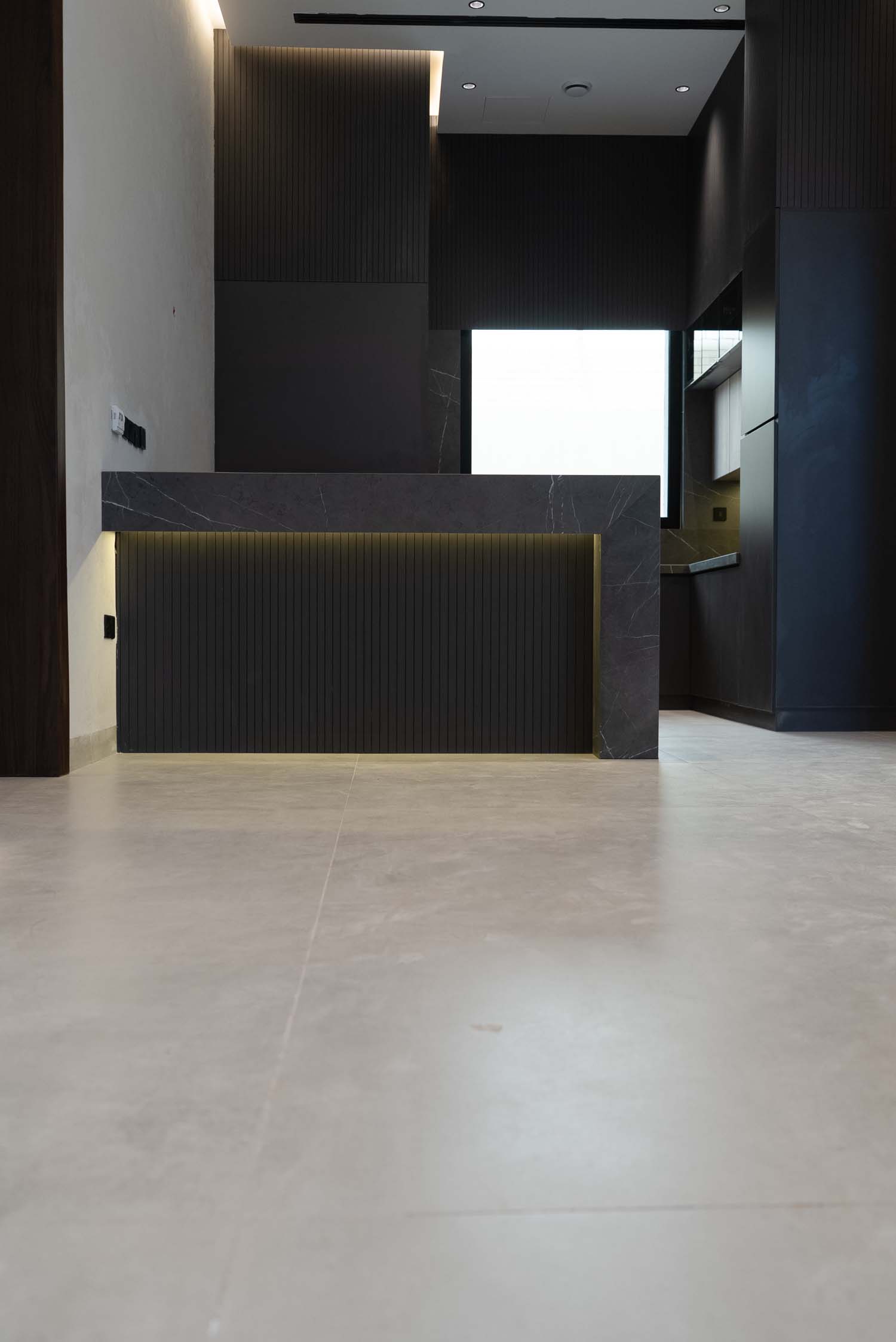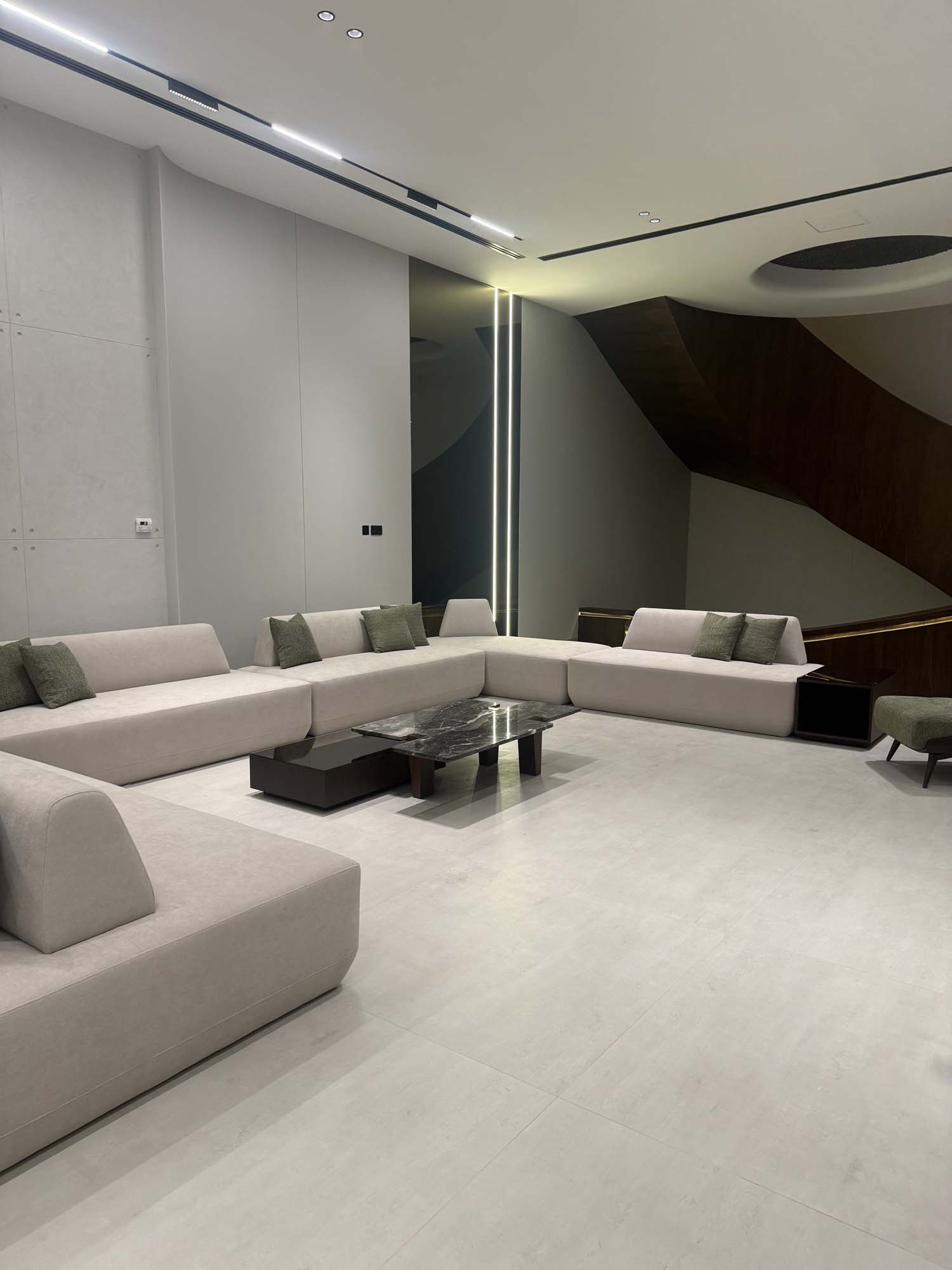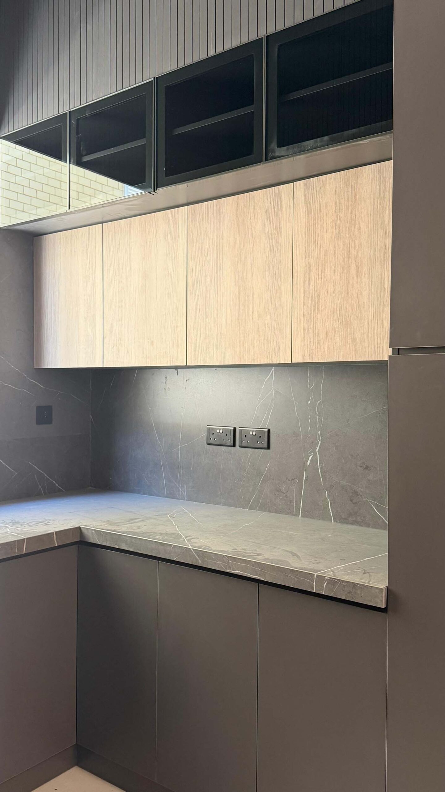 Complete interior finishing with custom woodwork, wall panels, kitchen installation, handrail, and bespoke furniture.